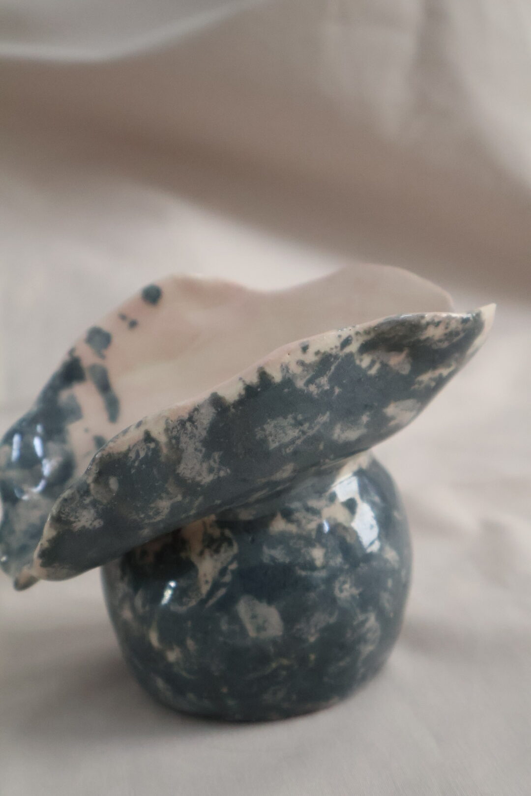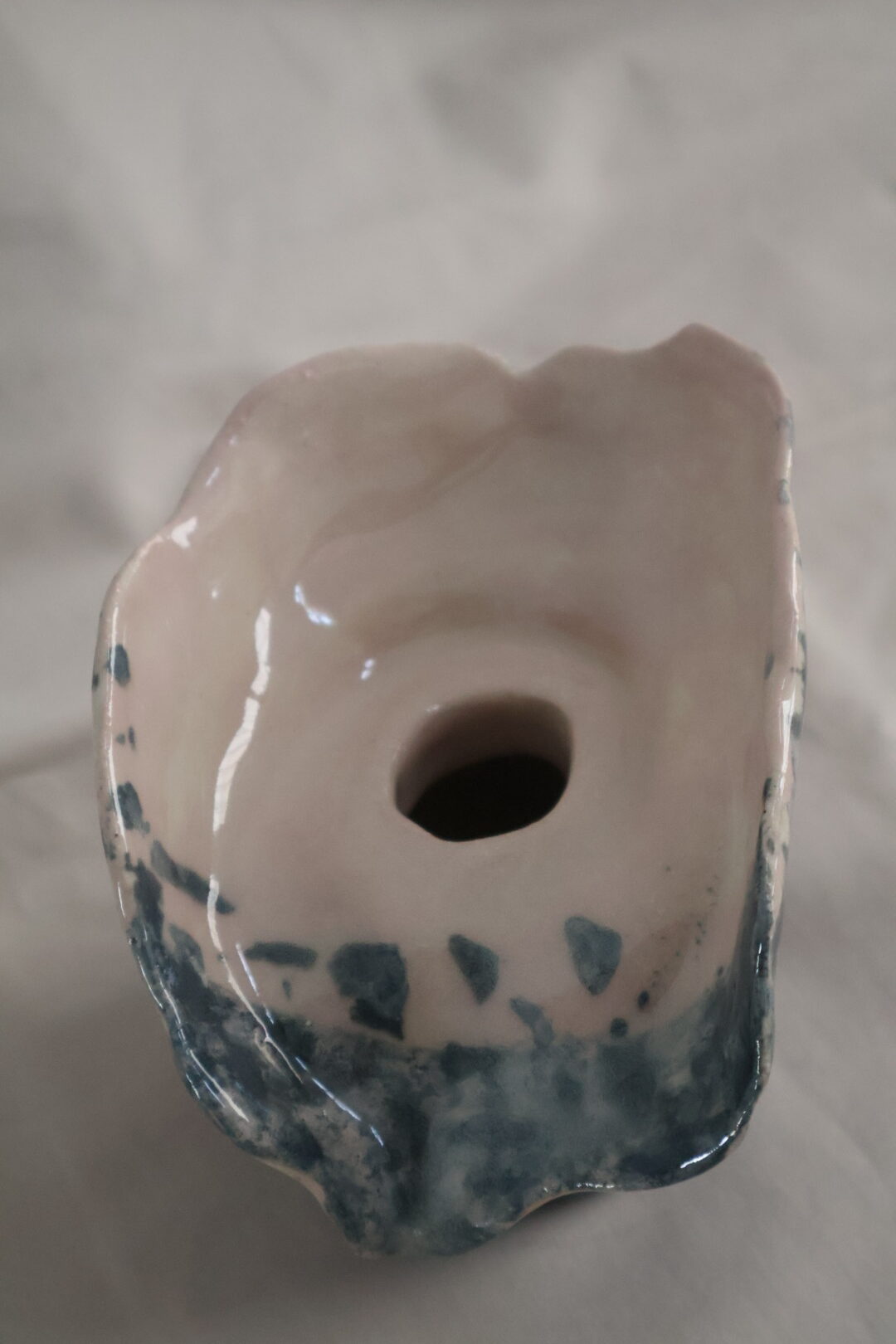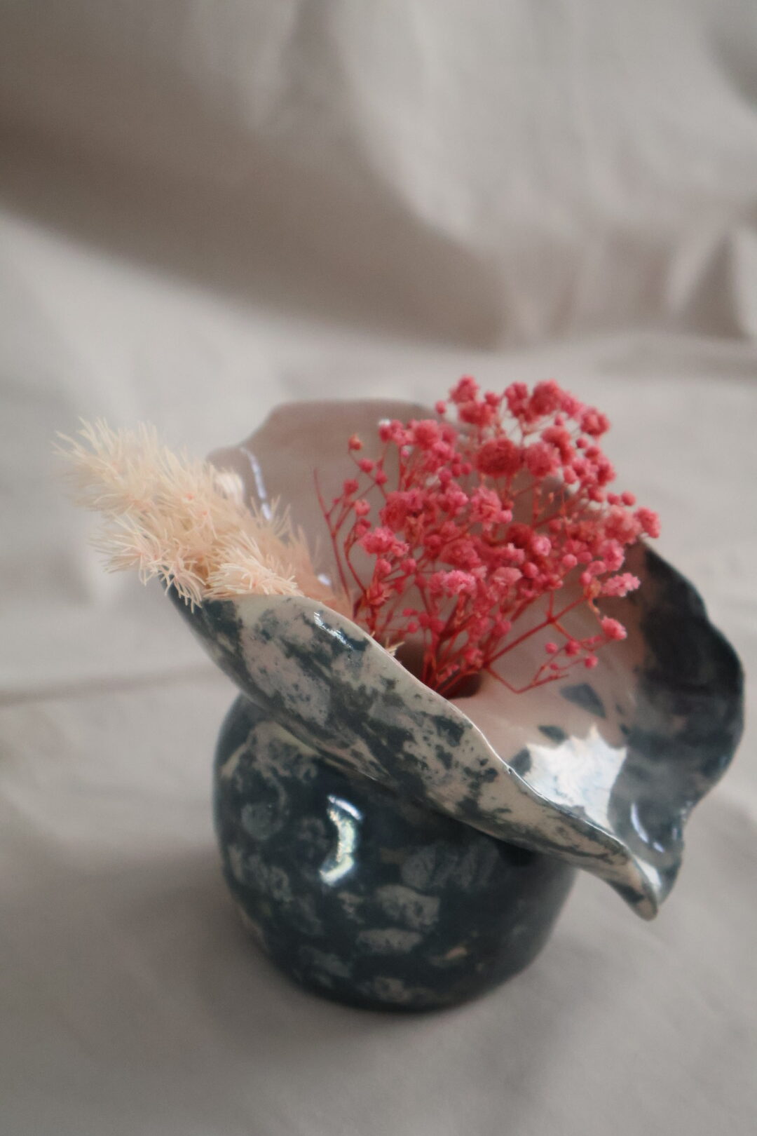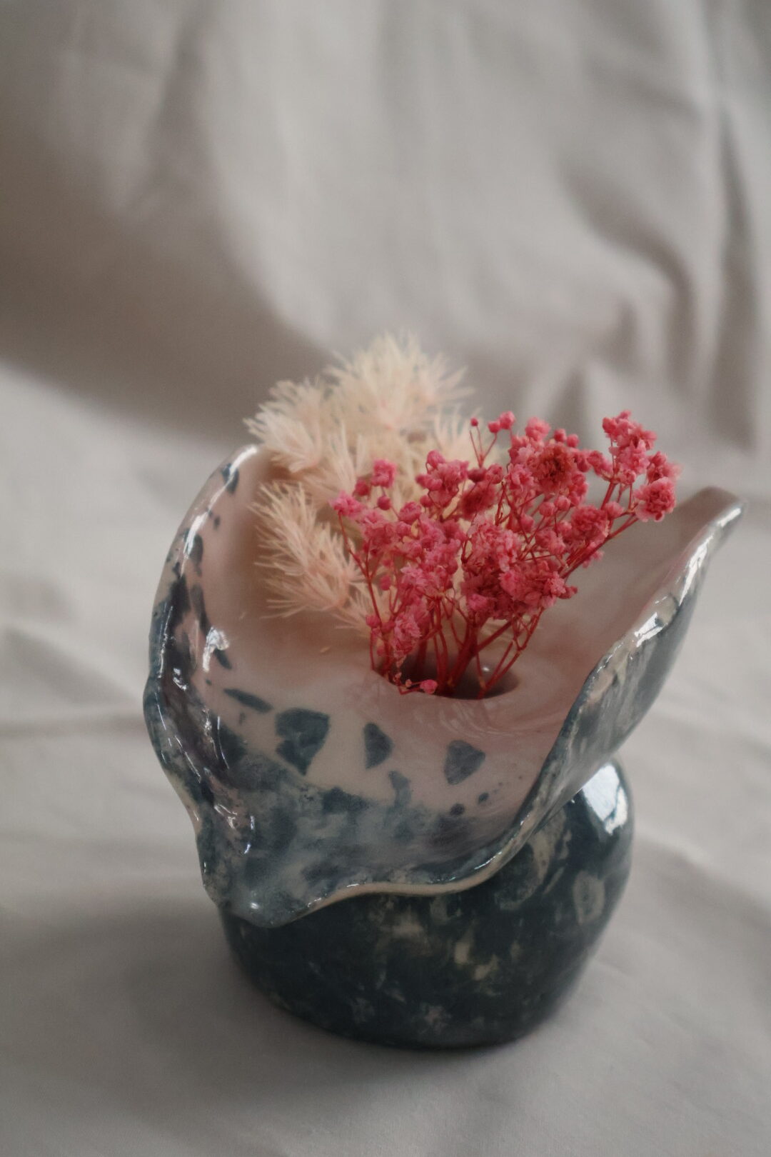 Κατασκευασμένο με ιδιαίτερη τεχνική, κάθε κομμάτι είναι μοναδικό, με κυματιστό στόμιο και γυαλιστερή υφή σε αποχρώσεις του βαθύ μπλε και απαλού ροζ. Ιδανικό για διακοσμητικά αποξηραμένα άνθη, το βάζο αυτό προσθέτει έναν μοντέρνο αλλά ταυτόχρονα γήινο χαρακτήρα σε κάθε εσωτερικό χώρο.